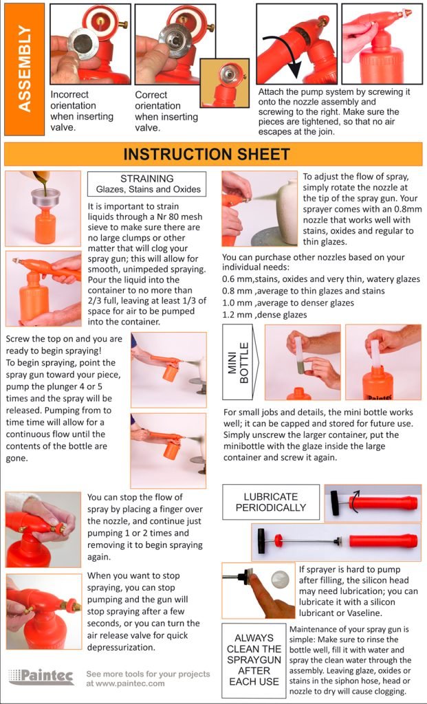 Make sure you clean your spray gun thoroughly after use. Maintenance of your spray gun is simple: Make sure to rinse the bottle well, fill it with water and spray the clean water through the assembly. Leaving glaze, oxides or stains in the siphon hose, head or nozzle to dry will cause clogging in the future.